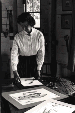 | Marian Weygers- the widow of Alex Weygers, is also an artist in her own right. She was a graduate of the University of California Berkeley as an art major and went on to teach in the public schools. At Berkeley Mrs. Weygers worked under the renowned professor, Chiura Obata, and from him studied sumi ink painting and design. Later on Marian developed a process of print making that she called, imprints from nature. Her prints are made with actual leaves, grasses, flowers, rocks, and insects. The plants themselves are used as a printers block or plate and are printed by hand. To make a perfect print requires careful manipulation of the ink, as well as pressure and control with hands and fingers. It is the intent of the artist to make a clean, meticulous print of the natural beauty of the plants, while at the same time producing an artistic result of good composition and arrangement. Marian resides in Carmel Valley, California and is very active in environmental and civic issues. - |